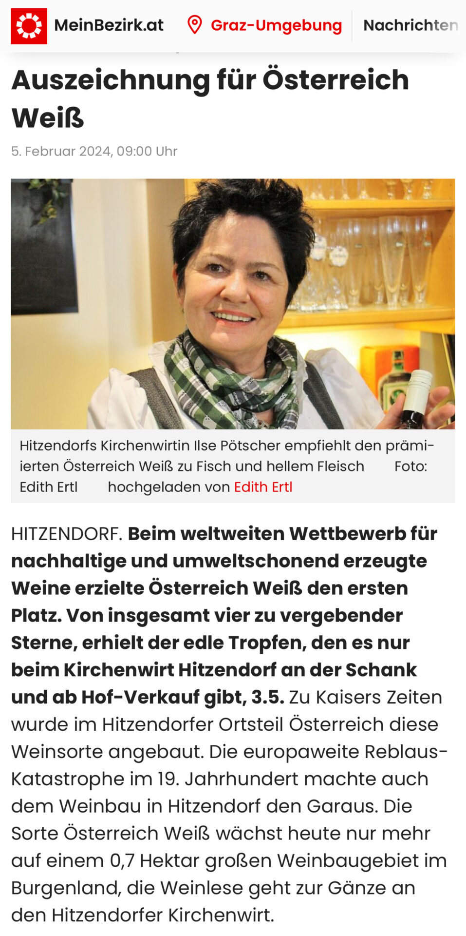 Ilse Pötscher führt den weit über den regionalen Raum hinaus bekannten „Kirchenwirt“, der längst als Geheimtipp gilt. Der Kirchenwirt besitzt eine wunderschöne Terrasse auf der man sich richtig erholen und kulinarisch verwöhnen lassen kann.